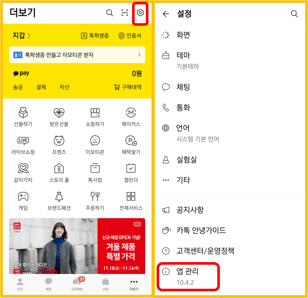 버전 확인은 카카오톡 더보기를 터치한 후 오른쪽 상단 톱니바퀴를 터치합니다.